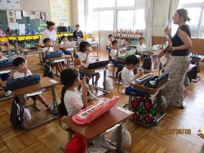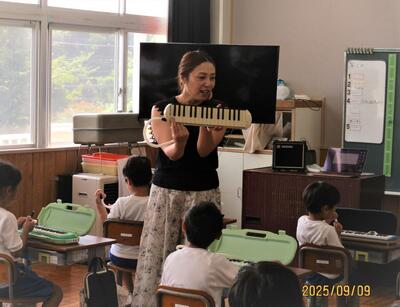 9月9日、1年生が講師の先生を迎えて、初めて使う「鍵盤ハ-モニカ」の学習をしました。楽器の扱い方や演奏方法、掃除の仕方を学び、最後に先生による生演奏を鑑賞しました。