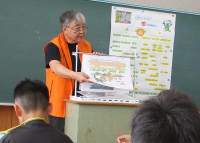 9月10日、県防災士会より大貫先生が来校され、4年生の社会科の授業で防災教育を実施しました。手作りの紙芝居を使って、防災に関するお話をしてくださいました。自然災害について、自分の命を守るためにできることなどを教えてくださいました。