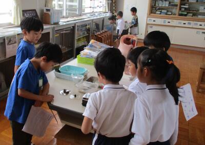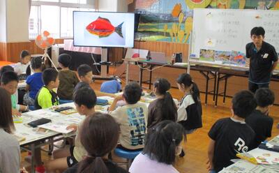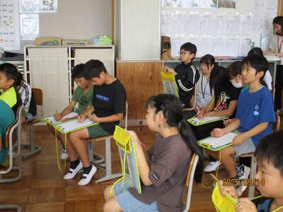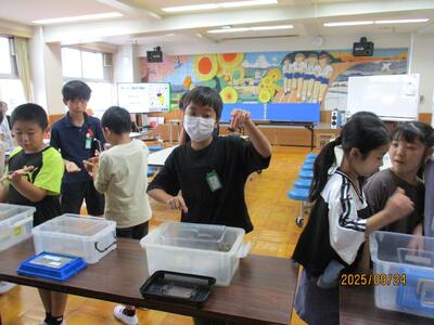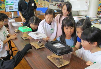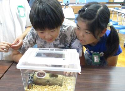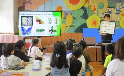 9月24日、3・4年生の「出前自然観察館」では、ふれあいの丘の自然観察館の館長さんを講師としてお迎えし、子どもたちの大好きな昆虫について教えてくださいました。子どもたちは、準備してくださった昆虫や標本、スライドに夢中でした。