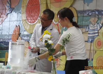 花の切り花を液体窒素に入れ、水分の凍結によりバラバラに砕ける姿や造花ではこの現象が起きないことなど、視覚的に捉えることができました。風船も液体窒素で冷やされるとどうなるのか、代表の児童が体験しました。