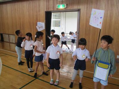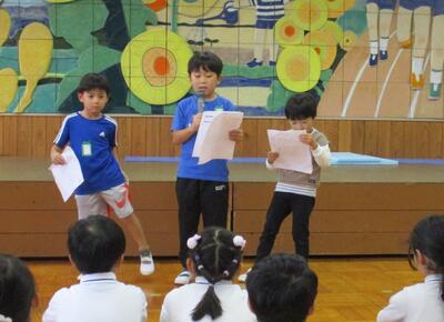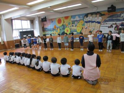 10月7日、1年生が幼保小交流会を行いました。なでしこ幼稚園のお友達がやってきました。学校探検は、1年生が校舎内を案内しました。また、校歌を歌って聴かせたり、運動会で踊ったダンスをお披露目したりしました。幼稚園生はとても楽しそうでした。