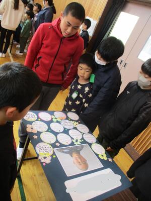 6年生が入場すると、6年生一人一人がお立ち台に立ち、全校生からお礼のメッセ-ジが送られました。