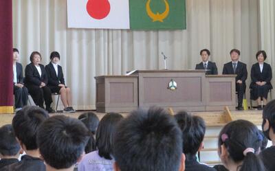 本日は、欠席0でスタ-トです。新しくお迎えした先生方との対面の「新任式」では、6年生の代表児童が歓迎のことばを伝えました。