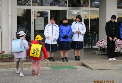 12月13日、金田南中学校の生徒の皆さんが本校に来てあいさつ運動を実施しました。たくさんの中学生が来校し、気持ちよい挨拶で出迎えてくださいました。帰りに、創立150周年記念で作成したまるぎょくんを見ていきました。