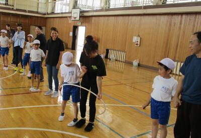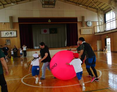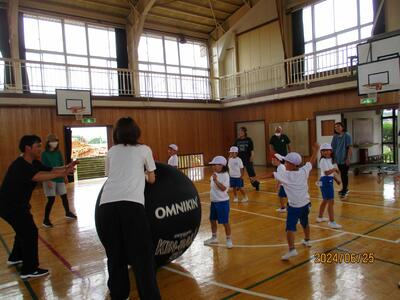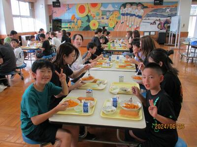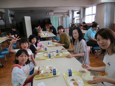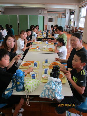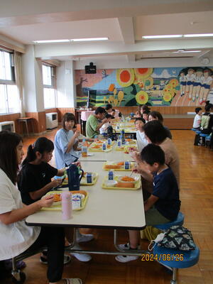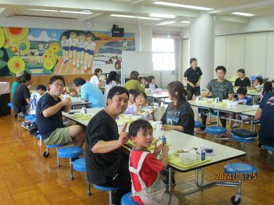 6月25日、1年生の部会行事が行われました。親子レクレ-ションでは、体育館でキンボ-ルを行いました。親子給食は、多目的ホ-ルでグル-プごとに食べました。子どもたちは、おうちの方と一緒でとてもうれしそうでした。