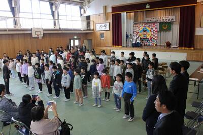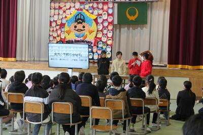 アトラクションとして、全校生で制作した折り紙ア-トをお披露目したり、第6学年総合的な学習の発表や全校合唱、那須神社神楽の会のばらまきを行いました。
