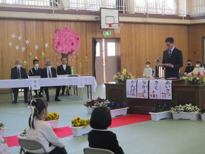 1年生は、担任の先生の呼名に、「はいっ。」と元気よく返事をし、また背筋をぴんと伸ばしてしっかり話を聞くことができました。校長からは、4つのお願い「あいさつ」「きく」「なかよし」「がんばる」のお話をしました。児童代表の3年生が歓迎の言葉を述べました。堂々として素晴らしかったです。