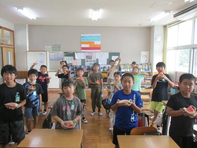 4年生が畑で育てたスイカが2個大きく育ち、みんなで少しずつ分けて食べました。