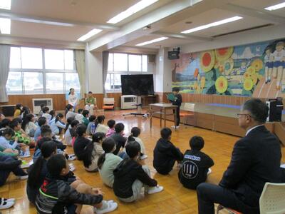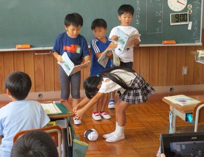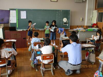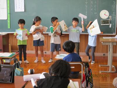 9月9日、1年生が「おむすびころりん」の音読劇発表会を行いました。