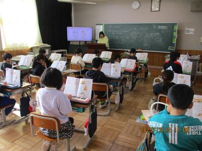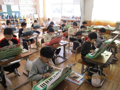 12月17日、1年生が音楽の時間、先生方や2年生を招待して、ミニミニ音楽発表会を実施しました。鍵盤ハ-モニカやトライアングル、鉄琴などの楽器で「きらきらぼし」を演奏しました。音がそろってとてもじょうずに演奏できました。次に、担任の先生にプレゼントする替え歌で「春夏秋冬」を聴かせてくれました。最後に、2年生と一緒に「MUSIC」を歌って聴かせてくれました。「MUSIC」は、市の音楽祭で4・5・6年生が歌った歌です。